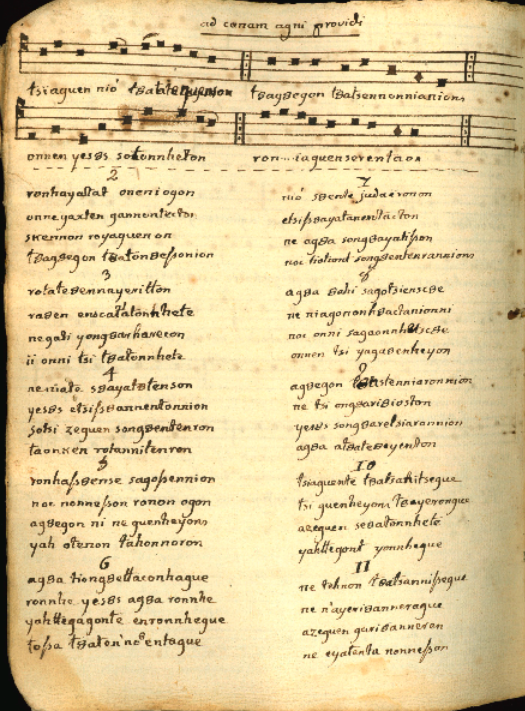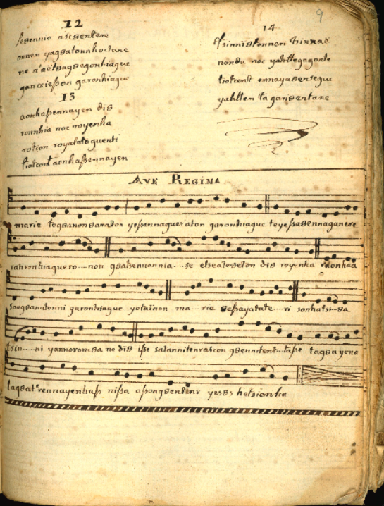 Un manuscrit sulpicien du 18e siècle qui contient des traductions dans la langue Mohawk des chants liturgiques catholiques. (The Newberry Library, VAULT Ruggles 393, p. 8v-9r)